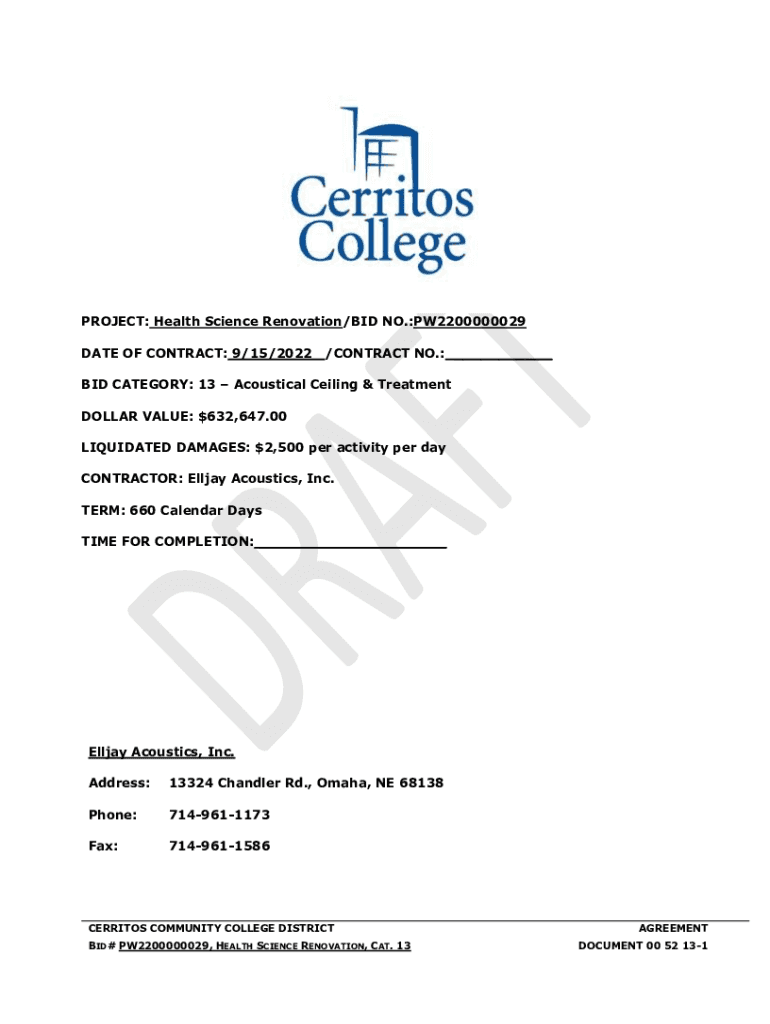 PROJECT: Health Science Renovation/BID NO.:PW2200000029 DATE OF CONTRACT: 9/15/2022/CONTRACT NO.: ___BID CATEGORY: 13 Acoustical Ceiling & Treatment DOLLAR VALUE: $632,647.00 LIQUIDATED DAMAGES: $2,500