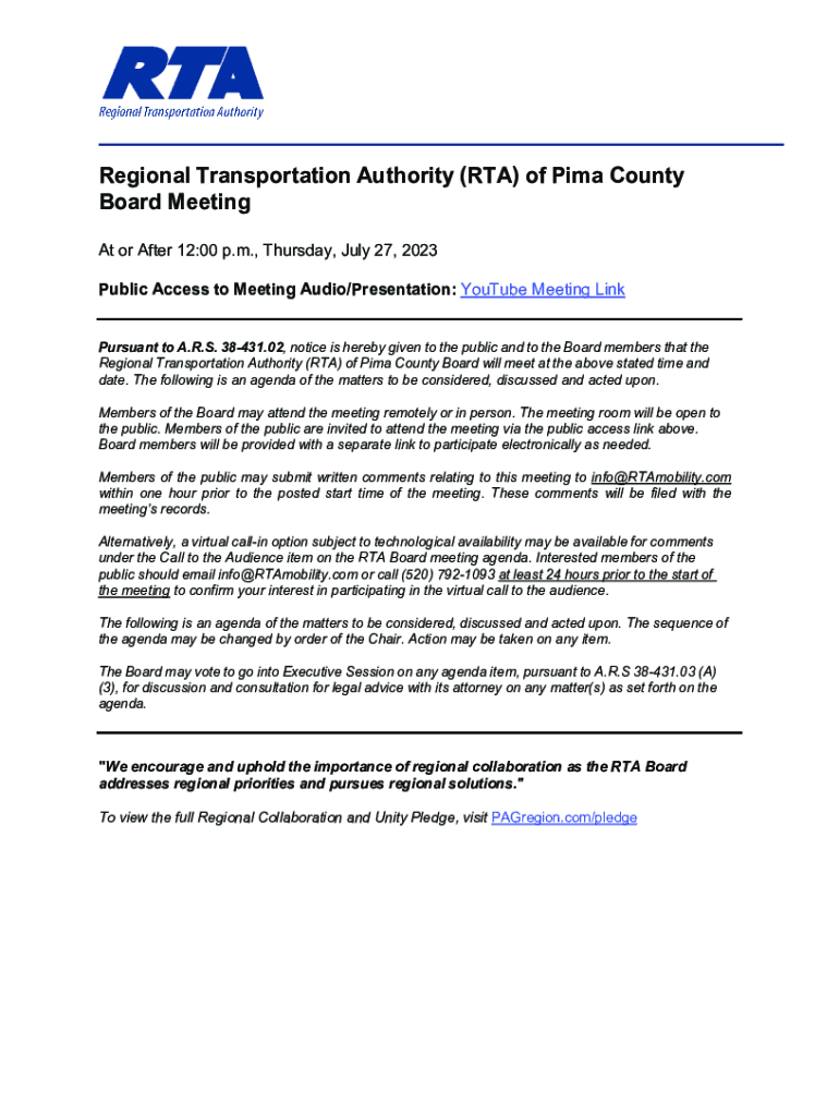 Regional Transportation Authority (RTA) of Pima County Board Meeting At or After 12:00 p.m., Thursday, July 27, 2023, Public Access to Meeting Audio/Presentation: YouTube Meeting Link Pursuant to