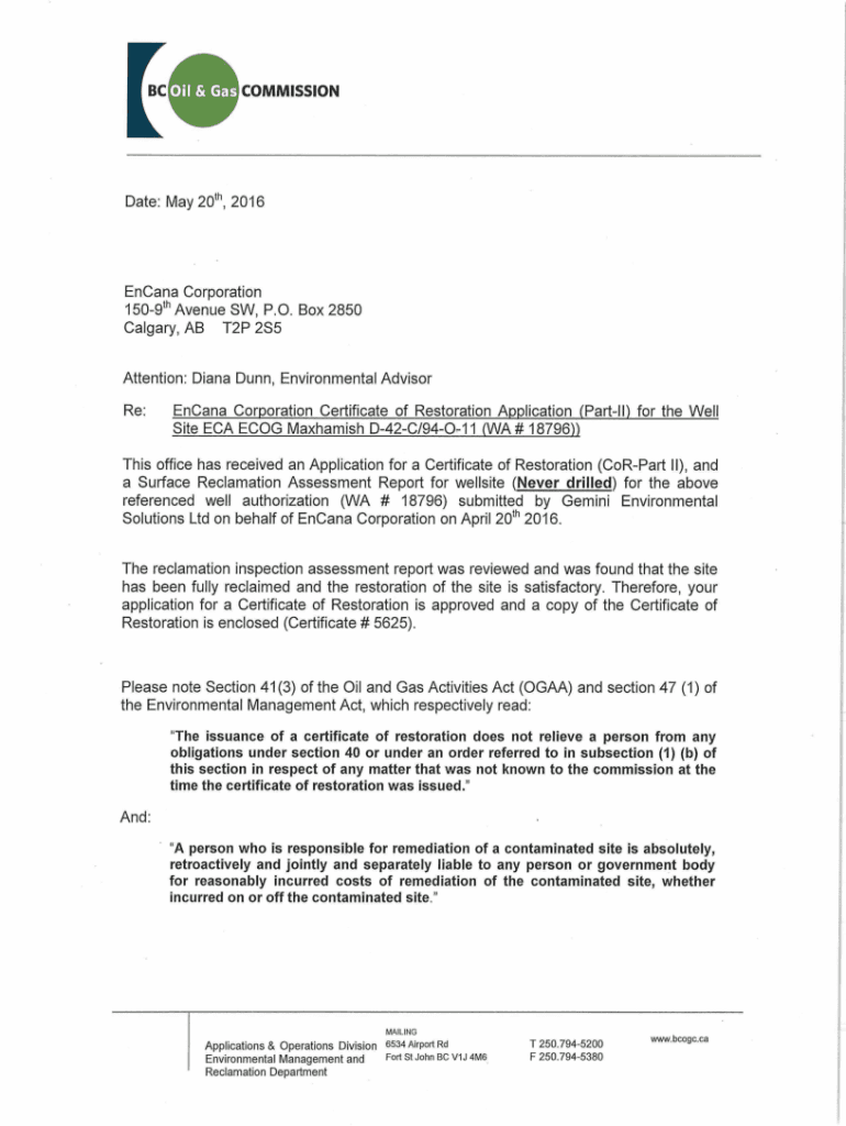 BC[NI. Terri compassionate: May 20th, 2016EnCana Corporation 1509th Avenue SW, P.O. Box 2850 Calgary, AB T2P 2S5 Attention: Diana Dunn, Environmental Advisor Re:NCAA Corporation Certificate of Restoration