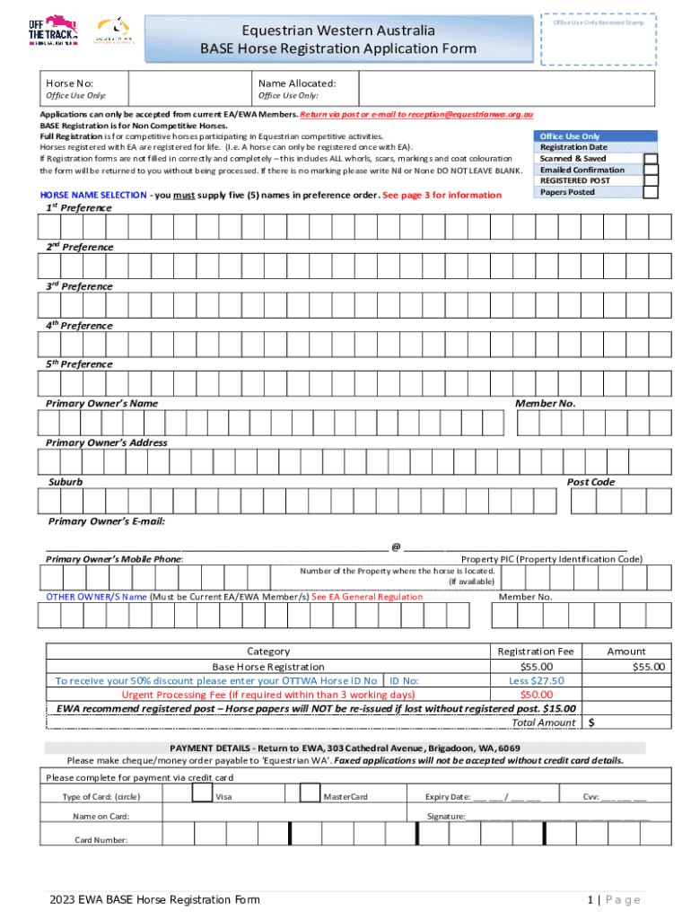 Office Use Only Received StampEquestrian Western Australia BASE Horse Registration Application Form Name Allocated:Horse No:Office Use Only:Office Use Only:Applications can only be accepted from current