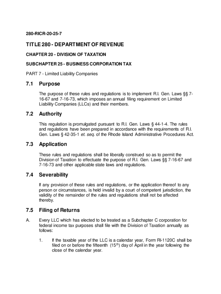 280RICR20257TITLE 280 DEPARTMENT OF REVENUE CHAPTER 20 DIVISION OF TAXATION SUBCHAPTER 25 BUSINESS CORPORATION TAX PART 7 Limited Liability Companies7.1Purpose The purpose of these rules and regulations