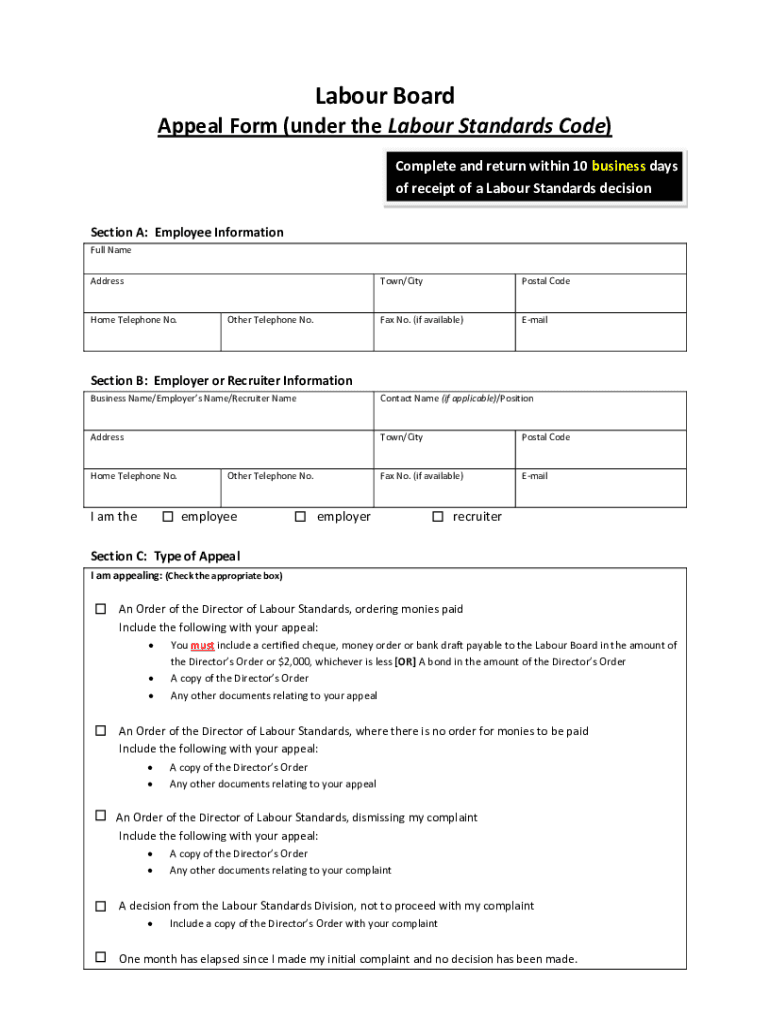Get the free Appeal Form (under the Labour Standards Code)