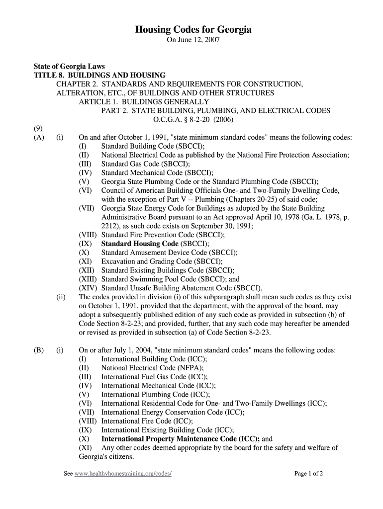 Housing Codes for Georgia On June 12, 2007State of Georgia Laws TITLE 8. BUILDINGS AND HOUSING CHAPTER 2. STANDARDS AND REQUIREMENTS FOR CONSTRUCTION, ALTERATION, ETC., OF BUILDINGS AND OTHER STRUCTURES