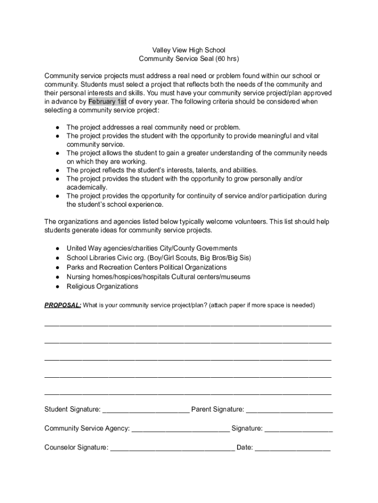 Valley View High School Community Service Seal (60 hrs) Community service projects must address a real need or problem found within our school or community. Students must select a project that reflects