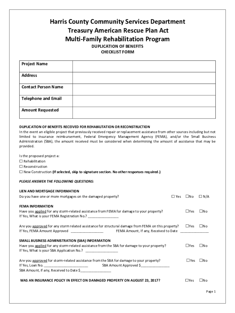 Harris County Community Services Department Treasury American Rescue Plan Act MultiFamily Rehabilitation Program DUPLICATION OF BENEFITS CHECKLIST FORMProject Name Address Contact Person Name Telephone