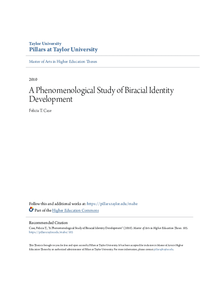 Taylor UniversityPillars at Taylor University Master of Arts in Higher Education Theses2010A Phenomenological Study of Biracial Identity Development Felicia T. Cashflow this and additional works at: