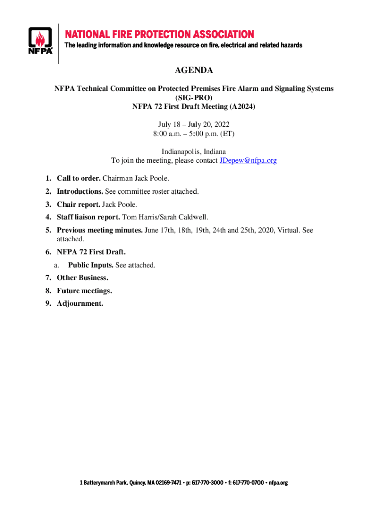 AGENDA NFPA Technical Committee on Protected Premises Fire Alarm and Signaling Systems (SIG PRO) NFPA 72 First Draft Meeting (A2024) July 18 July 20, 2022 8:00 a.m. 5:00 p.m. (ET) Indianapolis, Indiana