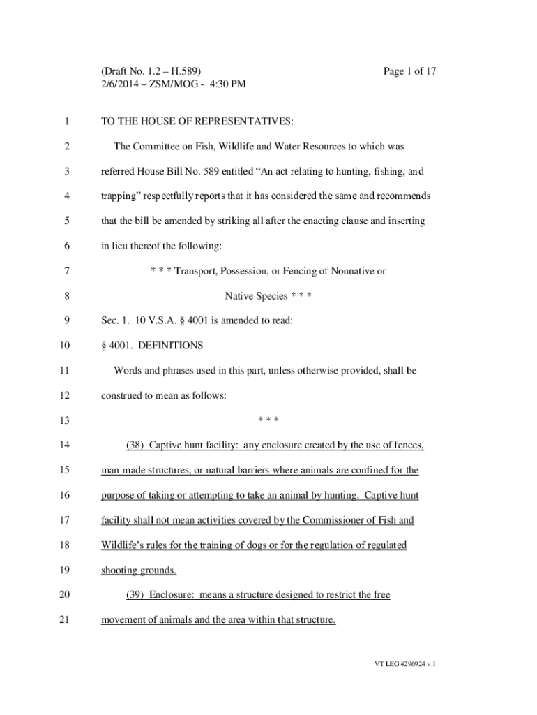 (Draft No. 1.2 H.589) 2/6/2014 DSM/DOG 4:30 PM1 2Page 1 of 17TO THE HOUSE OF REPRESENTATIVES: The Committee on Fish, Wildlife and Water Resources to which was3referred House Bill No. 589 entitled
