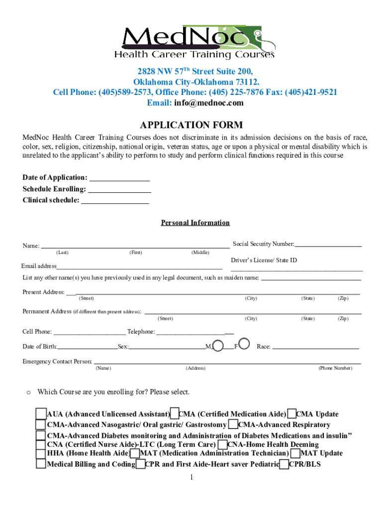 2828 NW 57Th Street Suite 200, Oklahoma City Oklahoma 73112. Cell Phone: (405)5892573, Office Phone: (405) 2257876 Fax: (405)4219521 Email: info@mednoc.comAPPLICATION FORM Medic Health Career Training