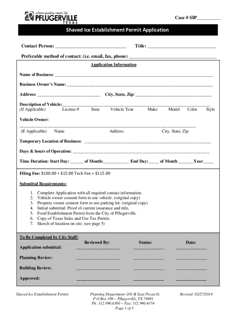 Case # SIP___Shaved Ice Establishment Permit Application Contact Person: ___Title: ___Preferable method of contact: (i.e. email, fax, phone) ___ Application Information Name of Business: ___ Business