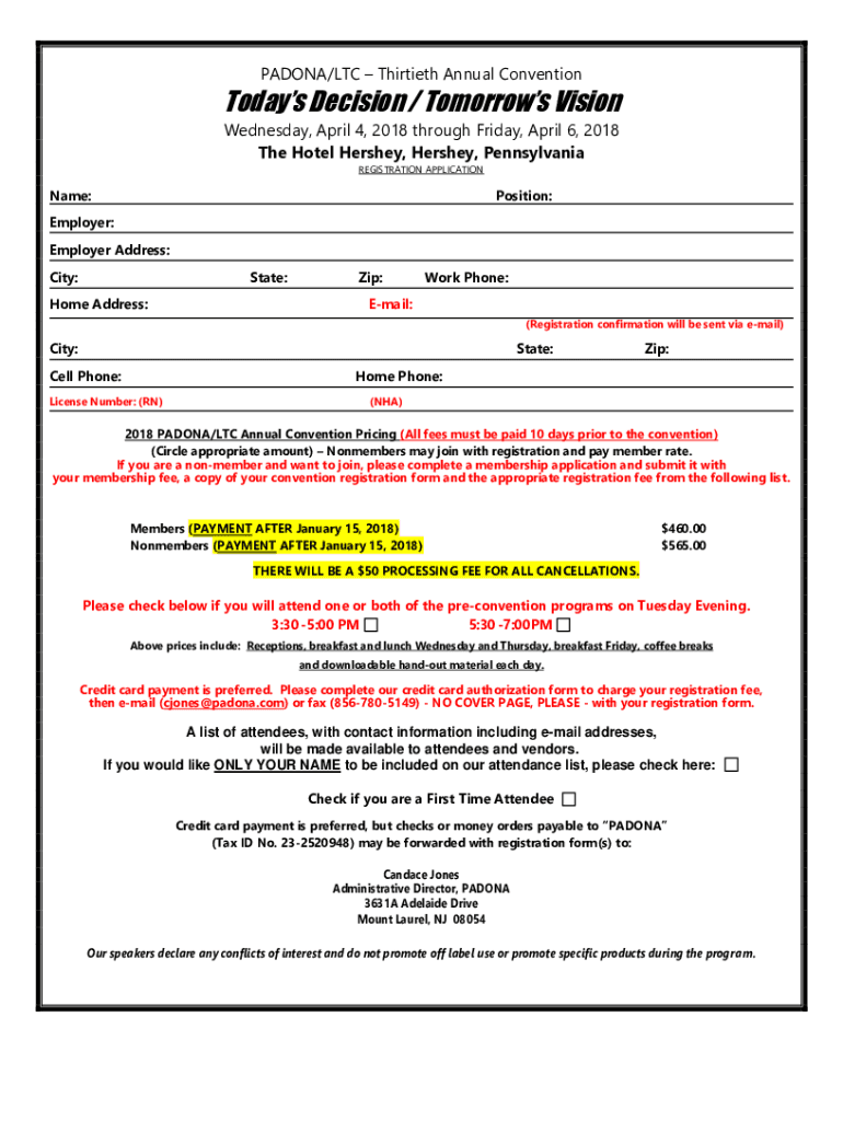 MADONNA/LTC Thirtieth Annual ConventionTodays Decision / Tomorrow's Vision Wednesday, April 4, 2018, through Friday, April 6, 2018, The Hotel Hershey, Hershey, Pennsylvania REGISTRATION APPLICATIONName:Position:Employer:
