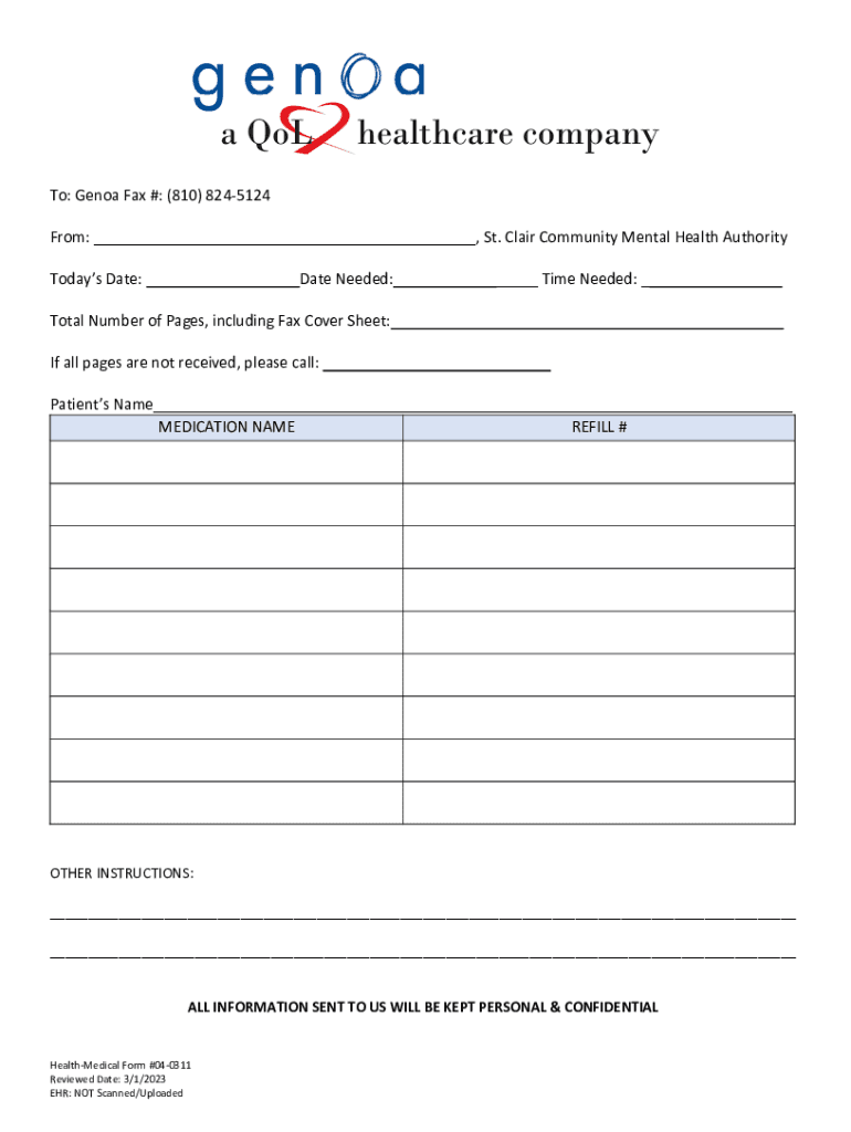 To: Genoa Fax #: (810) 8245124 From: ___, St. Clair Community Mental Health Authority Today's Date: ___Date Needed: ___ Time Needed: ___ Total Number of Pages, including Fax Cover Sheet:___If all