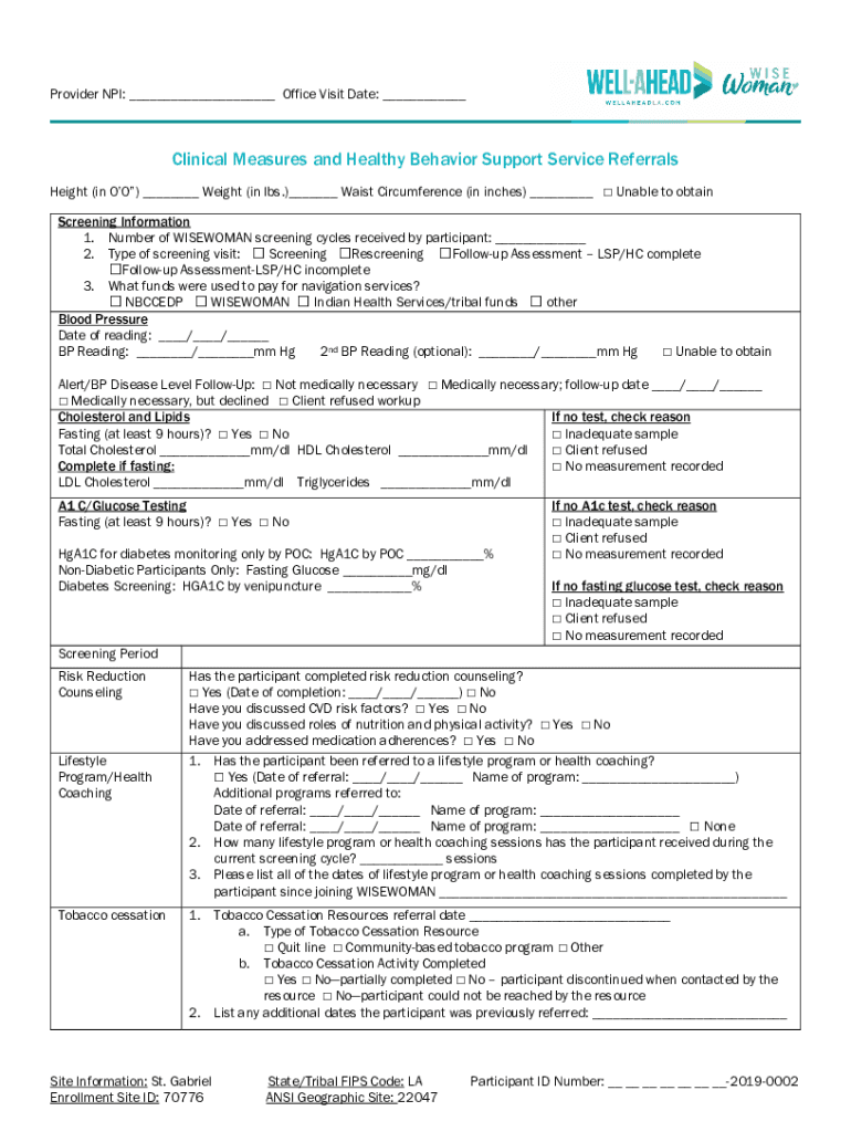 Provider NPI: ___ Office Visit Date: ___Clinical Measures and Healthy Behavior Support Service Referrals Height (in 00) ___ Weight (in lbs.)___ Waist Circumference (in inches) ___ Unable to obtain
