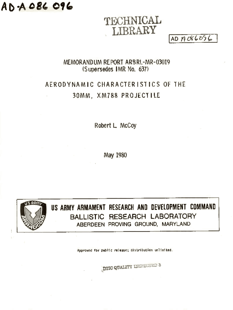 Ab\'A66 BIOTECHNICAL LIBRARY Adecco\'BC.MEMORANDUM REPORT ARBRLMR03019 (Supersedes I MR No. 637) AERODYNAMIC CHARACTERISTICS OF THE 30MM. XM788 PROJECTILE Robert L McCoy May 1980US ARMY ARMAMENT RESEARCH
