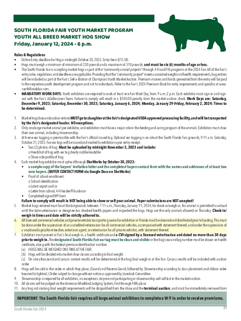 SOUTH FLORIDA FAIR YOUTH MARKET PROGRAMYOUTH ALL BREED MARKET HOG SHOW Friday, January 12, 2024 6 p.m. Rules & Regulations Online Entry deadline for Hog is midnight October 30, 2023. Entry fee is
