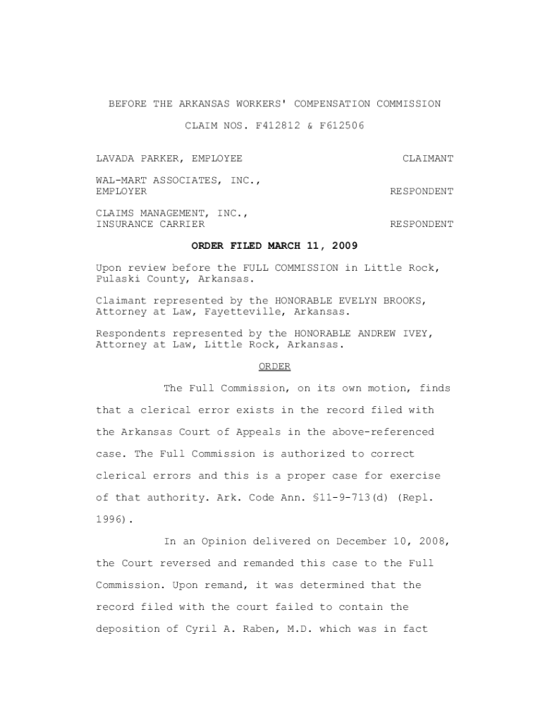 BEFORE THE ARKANSAS WORKERS\' COMPENSATION COMMISSION CLAIM NOS. F412812 & F612506 LAV ADA PARKER, EMPLOYEECLAIMANTWALMART ASSOCIATES, INC., EMPLOYERRESPONDENTCLAIMS MANAGEMENT, INC., INSURANCE CARRIERRESPONDENTORDER