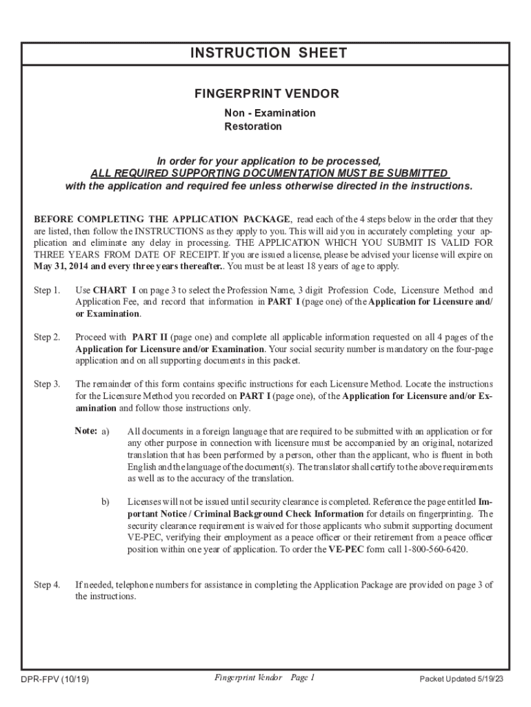 INSTRUCTION SHEET FINGERPRINT VENDOR Non Examination Restoration In order for your application to be processed, ALL REQUIRED SUPPORTING DOCUMENTATION MUST BE SUBMITTED with the application and required