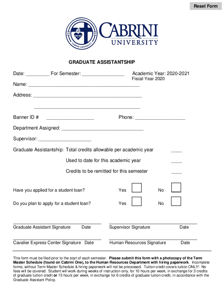 Reset Postgraduate ASSISTANTS HIP Date: ___ For Semester: ___Academic Year: 20202021 Fiscal Year 2020Name: ___ Address: ___ ___ Banner ID #___Phone: ___Department Assigned: ___ Supervisor: ___ Graduate