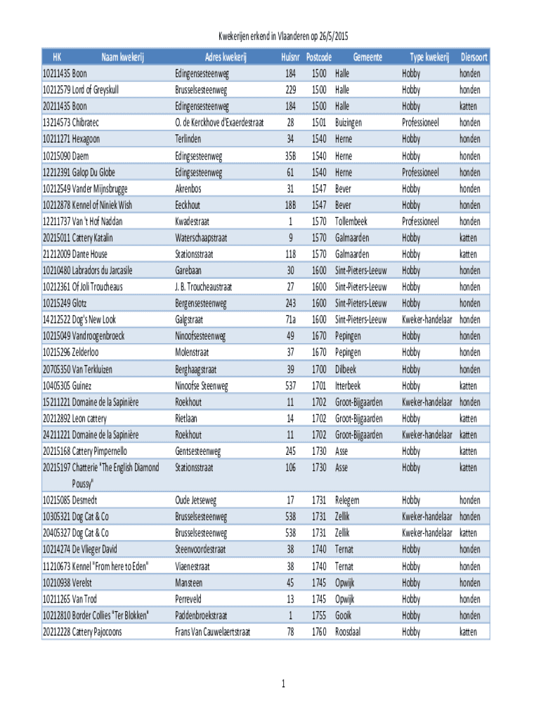 De informatie omvat de volledige naam van de kwekerij, adres, contactinformatie en registratiegegevens.