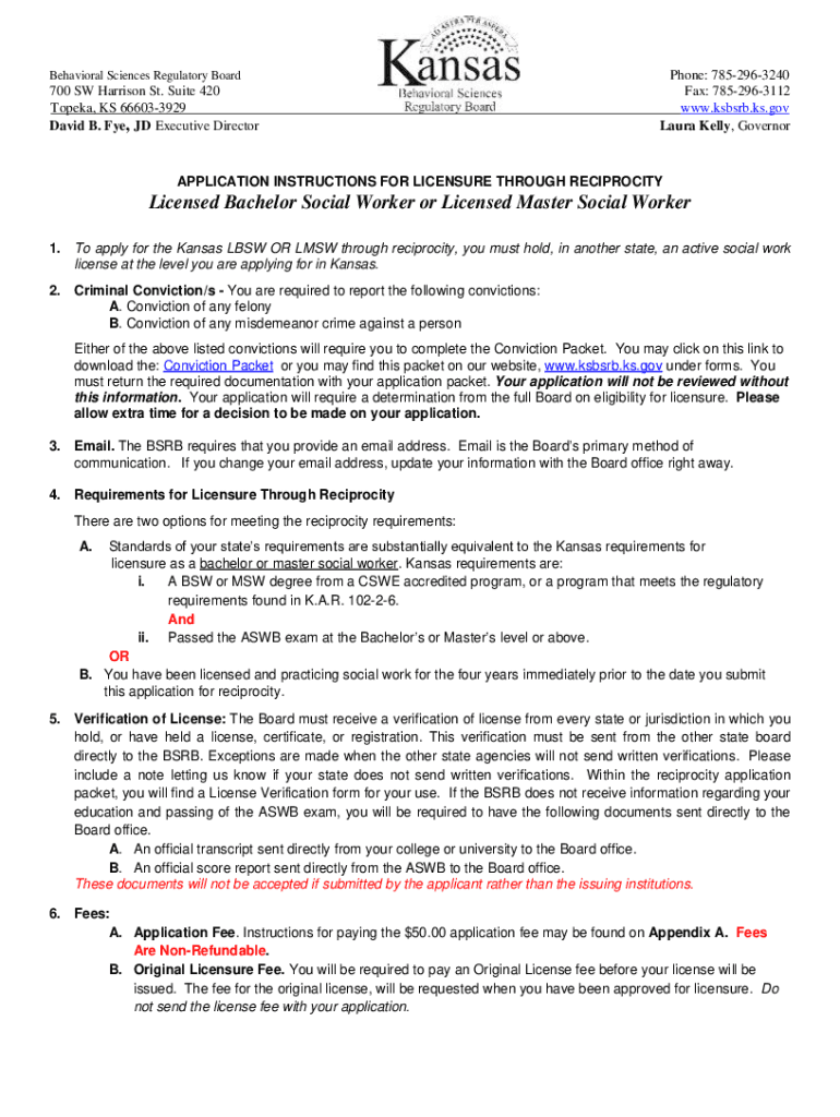 Behavioral Sciences Regulatory Board700 SW Harrison St. Suite 420 Topeka, KS 666033929 David B. FYE, JD Executive DirectorPhone: 7852963240 Fax: 7852963112 www.ksbsrb.ks.gov Laura Kelly, GovernorAPPLICATION
