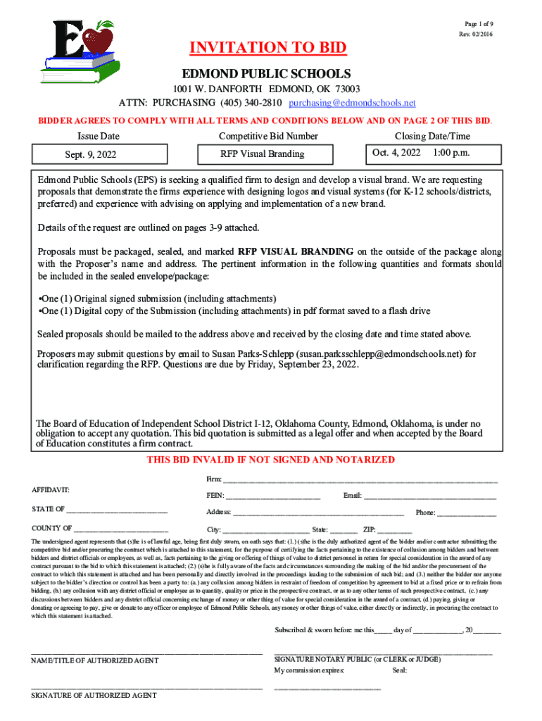 Page 1 of 9 Rev. 02/2016INVITATION TO BID EDMOND PUBLIC SCHOOLS 1001 W. DANFORTH EDMOND, OK 73003 ATTN: PURCHASING (405) 3402810 purchasing@edmondschools.netBIDDER AGREES TO COMPLY WITH ALL TERMS