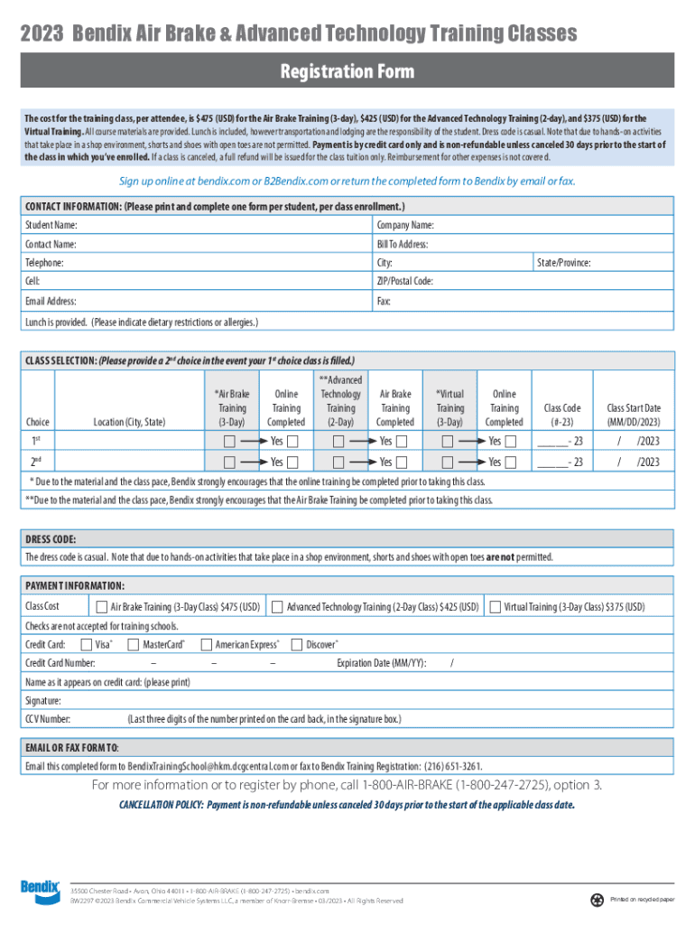 2023 Bendix Air Brake & Advanced Technology Training Classes Registration Form The cost for the training class, per attendee, is $475 (USD) for the Air Brake Training (3day), $425 (USD) for the Advanced