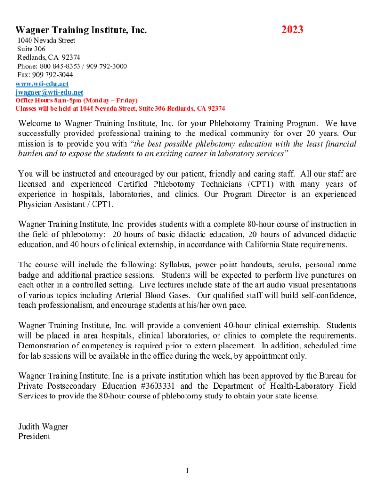 Wagner Training Institute, Inc.20231040 Nevada Street Suite 306 Redlands, CA 92374 Phone: 800 8458353 / 909 7923000 Fax: 909 7923044 www.wtiedu.net jwagner@wtiedu.net Office Hours 8am5pm (Monday Friday)