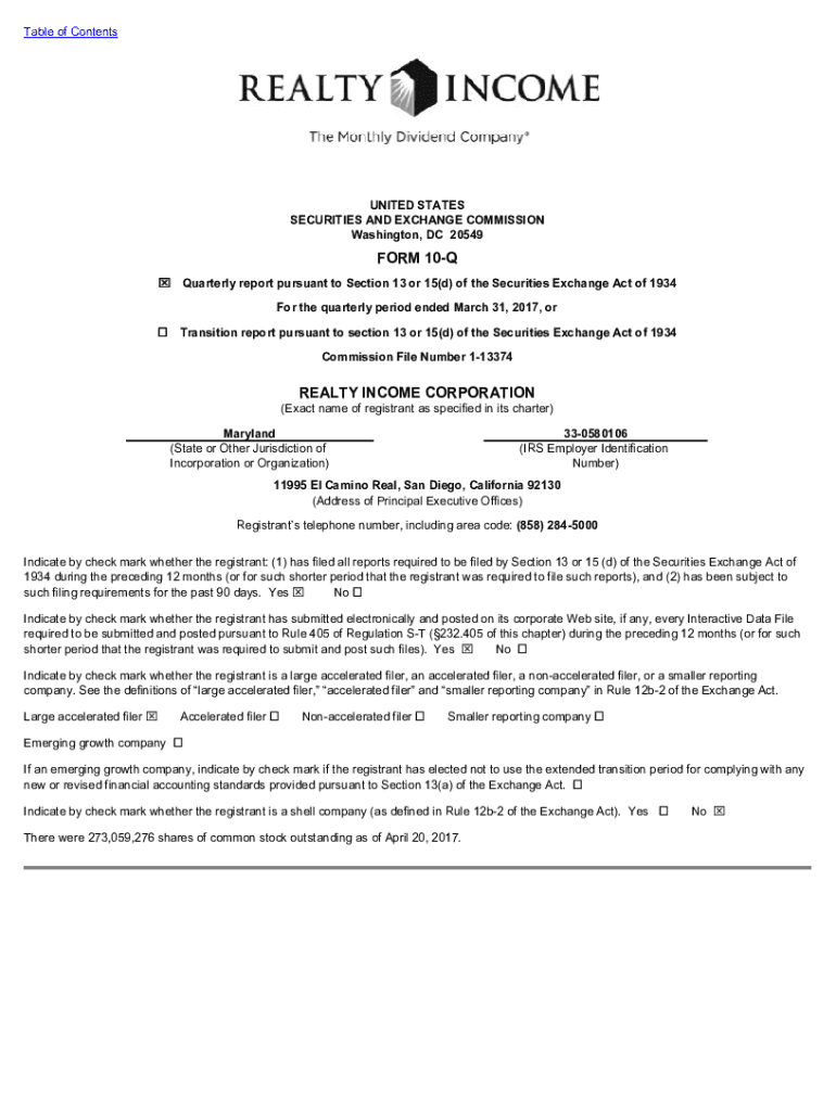 Transitionreportpursuanttosection13or15(d)oftheSecuritiesExchangeActof1934CommissionFileNumber113374REALTYINCOMECORPORATION