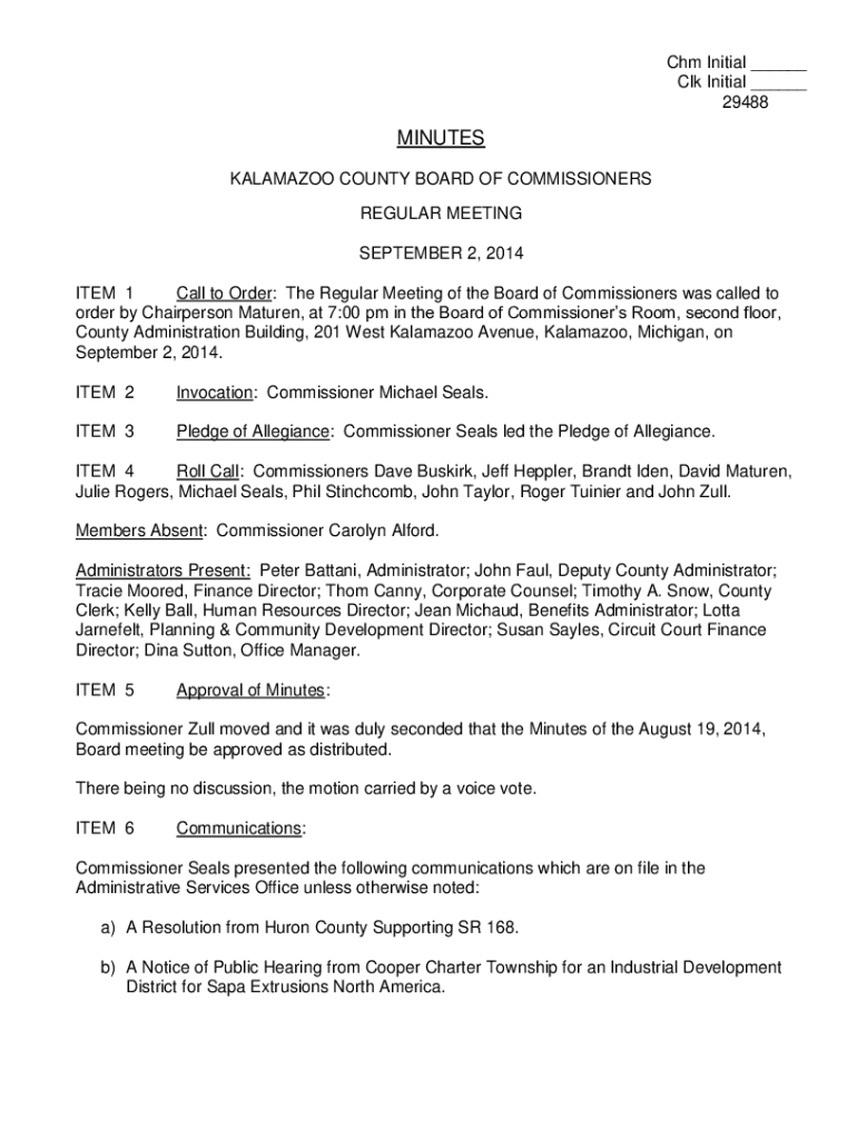 Chm Initial ___ Elk Initial ___ 29488MINUTES KALAMAZOO COUNTY BOARD OF COMMISSIONERS REGULAR MEETING SEPTEMBER 2, 2014, ITEM 1 Call to Order: The Regular Meeting of the Board of Commissioners was