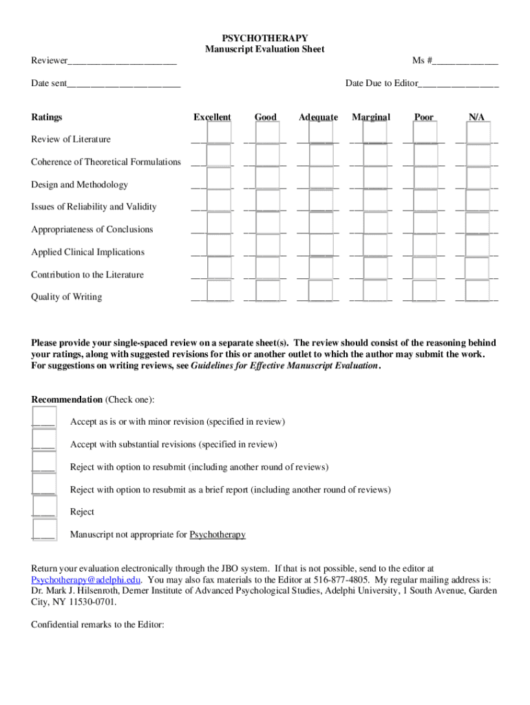 PSYCHOTHERAPY Manuscript Evaluation Sheet Reviewer___Ms #___Date sent___Date Due to Editor___RatingsExcellentGoodAdequateMarginalPoorN/Review of Literature__________________Coherence of Theoretical