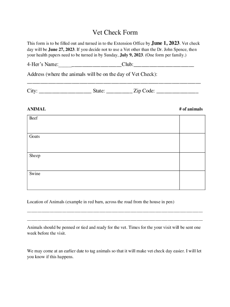 Vet Check Form This form is to be filled out and turned in to the Extension Office by June 1, 2023. Vet check day will be June 27, 2023. If you decide not to use a Vet other than the Dr. John Spence,