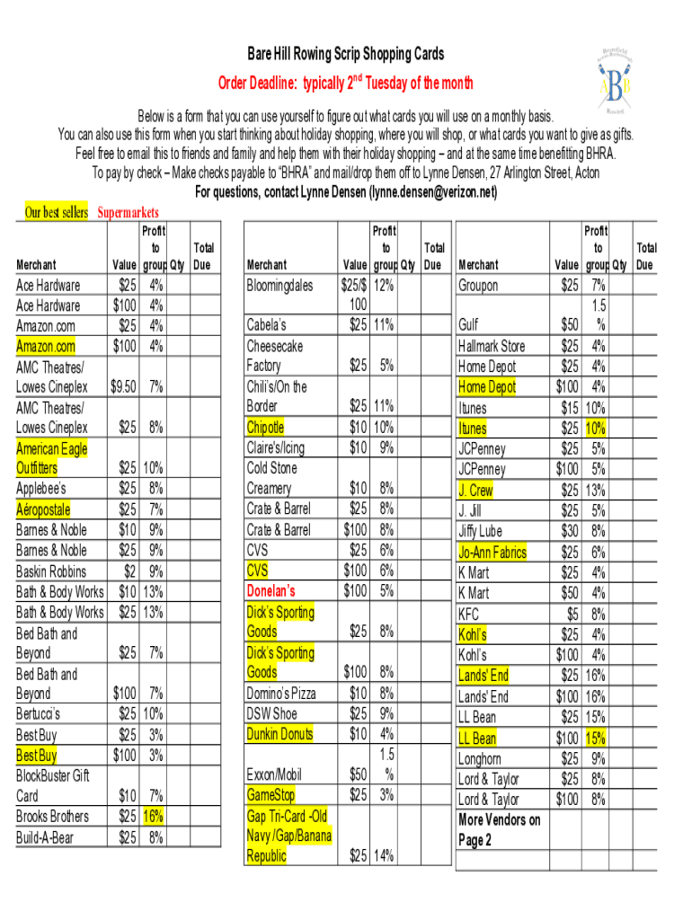 Bare Hill Rowing Scrip Shopping Cards Order Deadline: typically 2nd Tuesday of the month Below is a form that you can use yourself to figure out what cards you will use on a monthly basis. You can