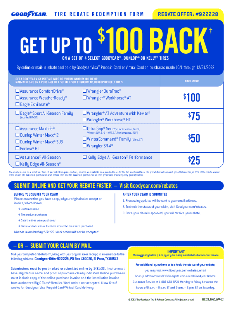 REBATE OFFER: #922228TIRE REBATE REDEMPTION FORGET UP TO100 JACKSON A SET OF 4 SELECT GOODYEAR, DUNLOP OR KELLY Tires online or mailing rebate and paid by Goodyear Visa Prepaid Card or Virtual Card