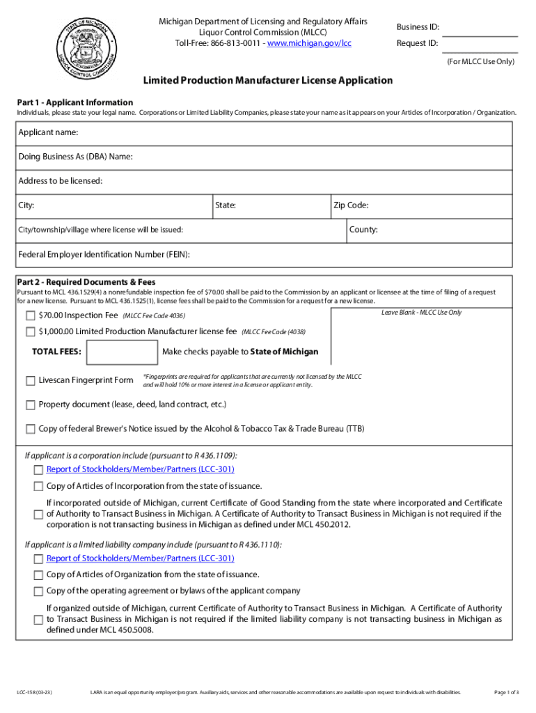 Michigan Department of Licensing and Regulatory Affairs Liquor Control Commission (LCC) Toll-free: 8668130011 www.michigan.gov/lccLimited Production Manufacturer License Information Pursuant to MCL