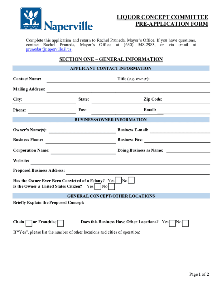 LIQUOR CONCEPT COMMITTEE REAPPLICATION FORM Complete this application and return to Rachel Pruned, Mayors Office. If you have questions, contact Rachel Pruned, Mayors Office, at (630) 5482983, or