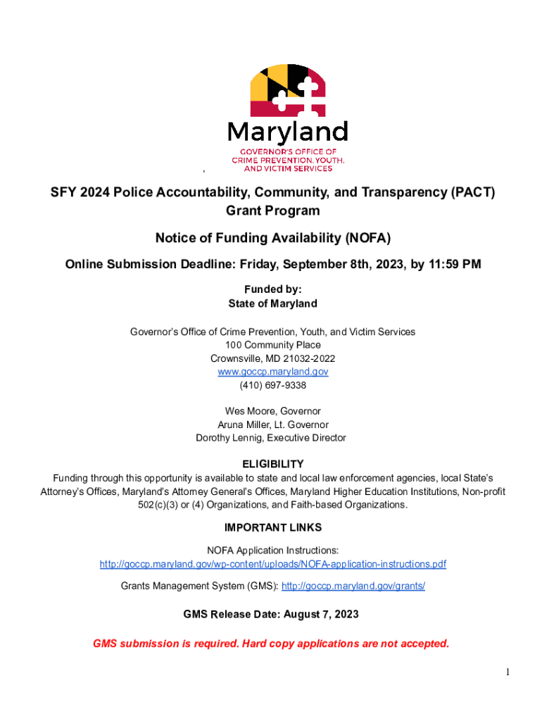 , SAY 2024 Police Accountability, Community, and Transparency (PACT) Grant Program Notice of Funding Availability (NOVA) Online Submission Deadline: Friday, September 8th, 2023, by 11:59 PM Funded
