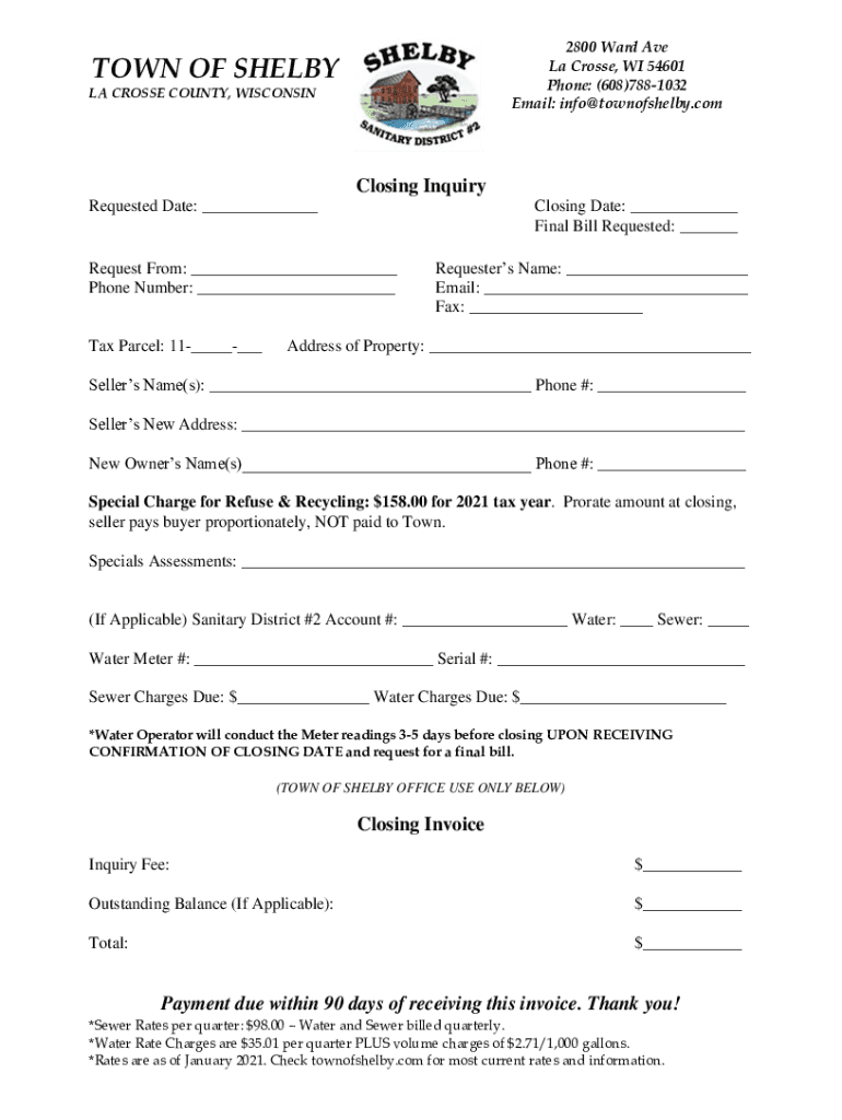 2800 Ward Ave La Crosse, WI 54601 Phone: (608)7881032 Email: info@townofshelby.comTOWN OF SHELBY LA CROSSE COUNTY, WISCONSINClosing Inquiry Requested Date: ___Closing Date: ___ Final Bill Requested: