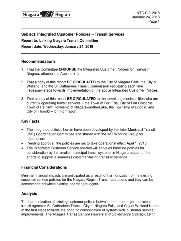 LN TCC 32018 January 24, 2018, Page 1Subject: Integrated Customer Policies Transit Services Report to: Linking Niagara Transit Committee Report date: Wednesday, January 24, 2018Recommendations 1.