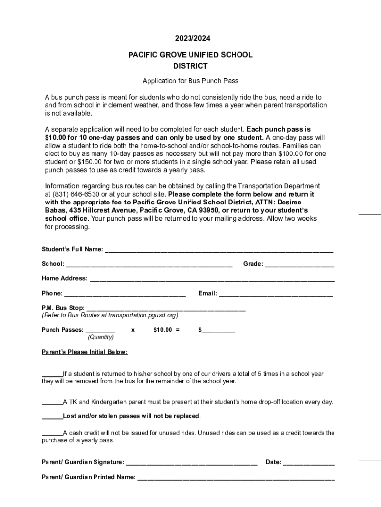 2023/2024 PACIFIC GROVE UNIFIED SCHOOL DISTRICT Application for Bus Punch Pass A bus punch pass is meant for students who do not consistently ride the bus, need a ride to and from school in inclement