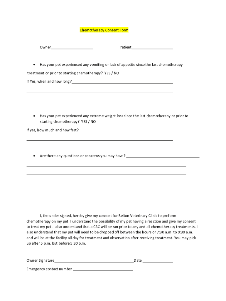 Get the free Chemotherapy Consent Form Owner Patient Has your pet ...