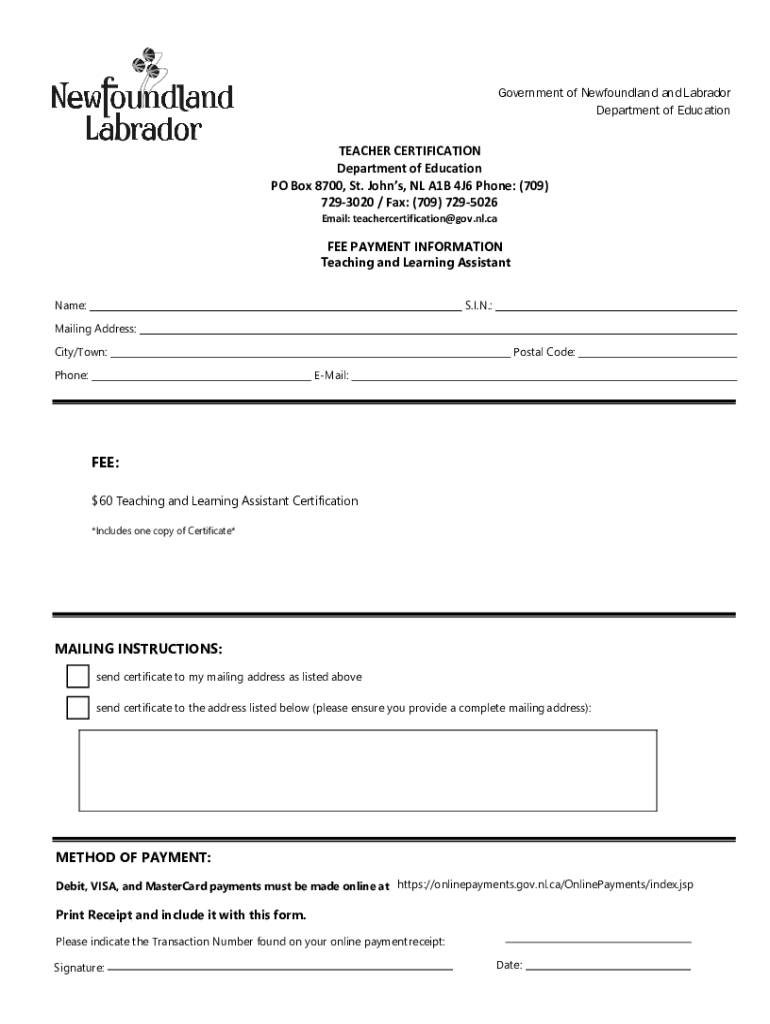 Government of Newfoundland and Labrador Department of EducationTEACHER CERTIFICATION Department of Education PO Box 8700, St. Johns, NL A1B 4J6 Phone: (709) 7293020 / Fax: (709) 7295026 Email: teachercertification@gov.nl.caFEE
