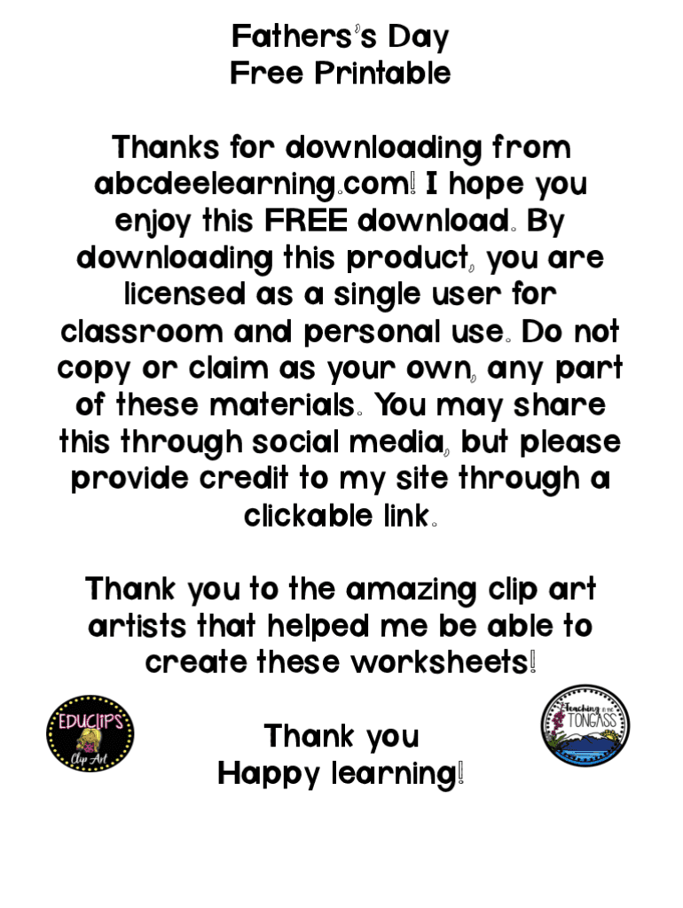 Fathers Day Free Printable Thanks for downloading from abcdeelearning.com! I hope you enjoy this FREE download. By downloading this product, you are licensed as a single user for classroom and personal