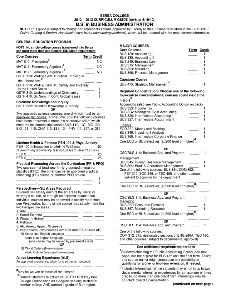 BERET COLLEGE 2012 2013 CURRICULUM GUIDE (revised 6/19/12)B.S. in BUSINESS ADMINISTRATION NOTE: This guide is subject to change and represents actions approved by Faculty to date. Please often refer