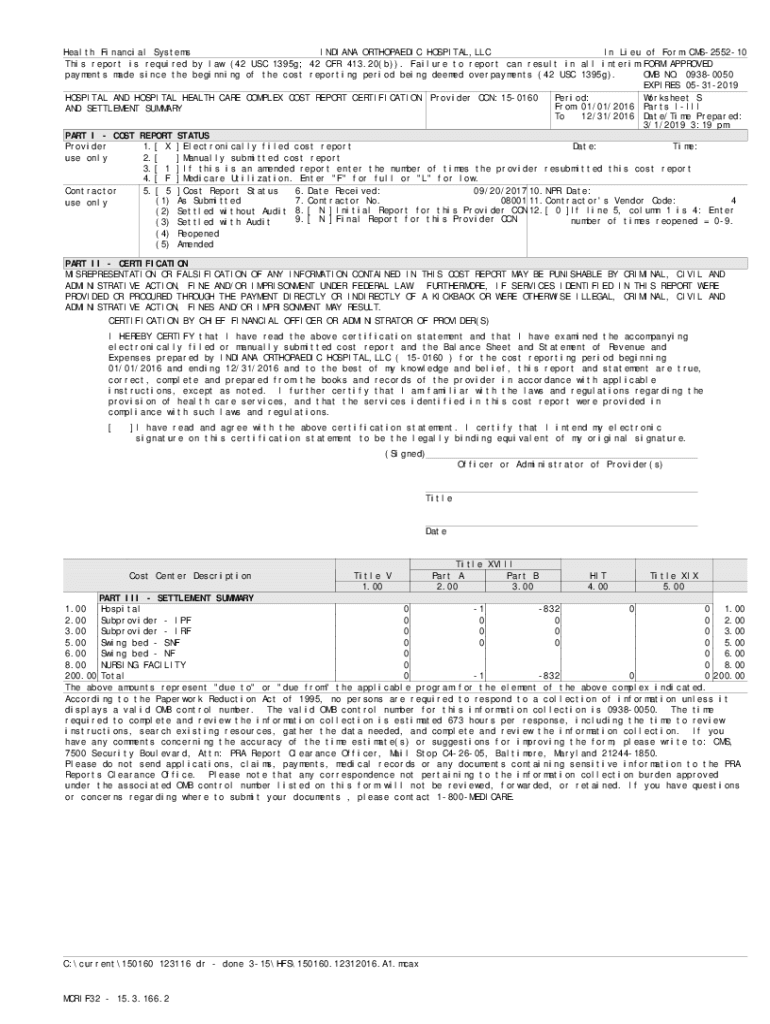 Health Financial Systems INDIANA Orthopedic HOSPITAL, LLC In Lieu of Form CMS255210 This report is required by law (42 USC 1395g; 42 CFR 413.20(b)). Failure to report can result in all interim FORM