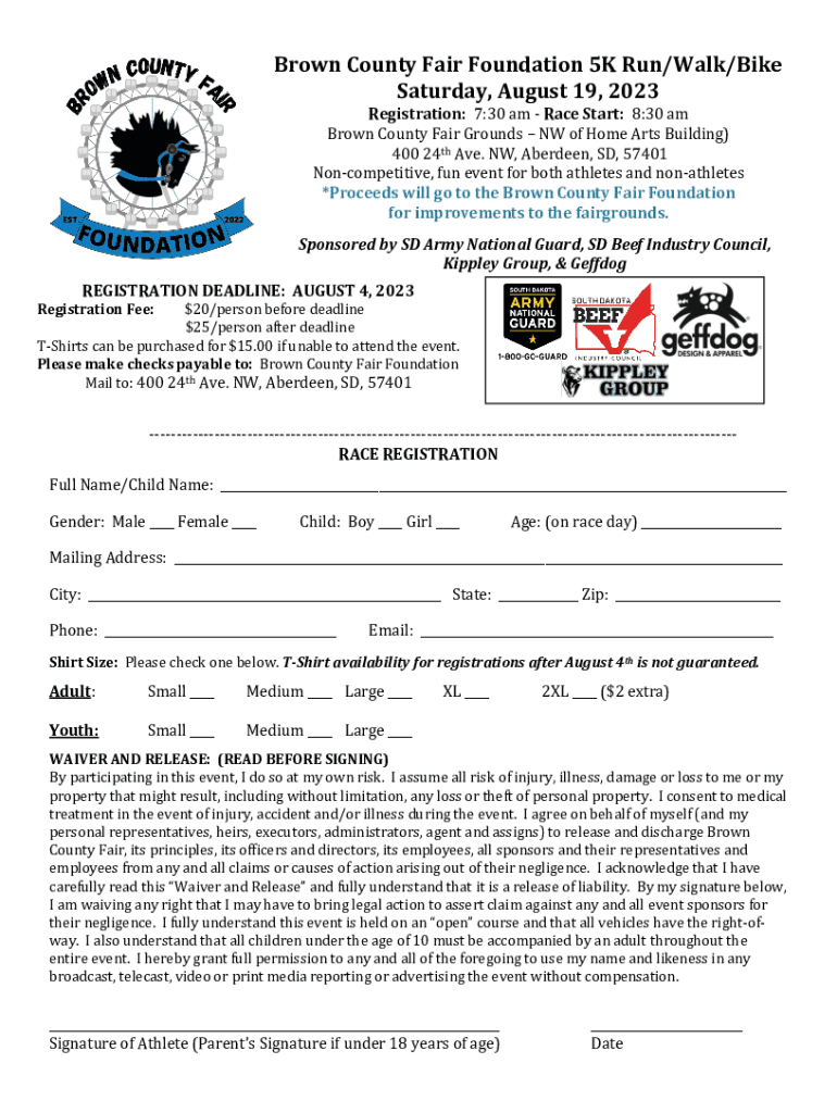 Brown County Fair Foundation 5K Run/Walk/Bike Saturday, August 19, 2023, Registration: 7:30 am Race Start: 8:30 am Brown County Fair Grounds NW of Home Arts Building) 400 24th Ave. NW, Aberdeen, SD,