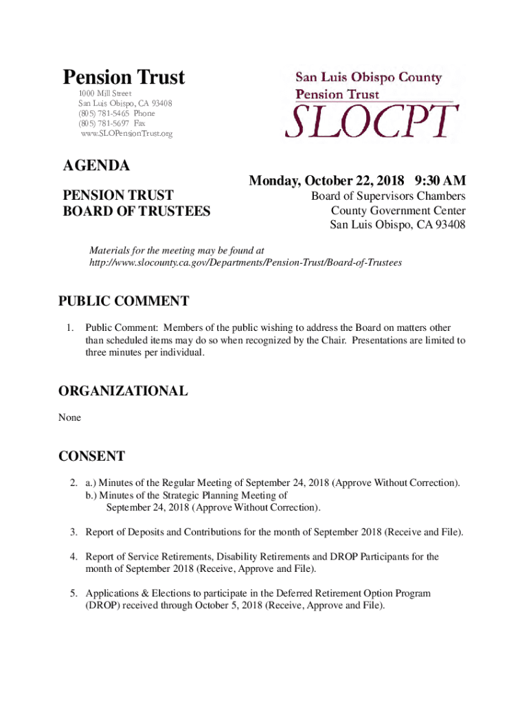Pension Trust 1000 Mill Street San Luis Obispo, CA 93408 (805) 7815465 Phone (805) 7815697 Fax www.SLOPensionTrust.orgAGENDA Monday, October 22, 2018 9:30 AM PENSION TRUST BOARD OF TRUSTEESBoard of