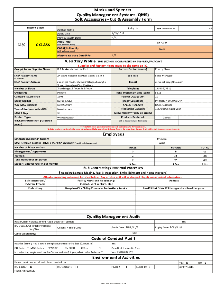 Factory Grade61%Ricky Auditor Name CLASSAudit Date1/24/2019Previous Audit Date