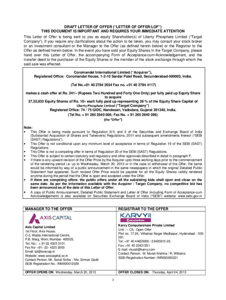 DRAFT LETTER OF OFFER (LETTER OF OFFER/LOF) THIS DOCUMENT IS IMPORTANT AND REQUIRES YOUR IMMEDIATE ATTENTION This Letter of Offer is being sent to you as equity Shareholder(s) of Liberty Phosphate