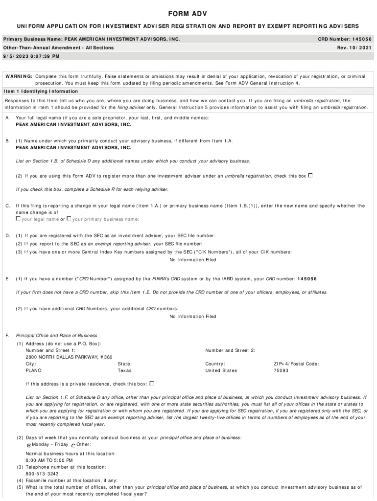 FORM ADV UNIFORM APPLICATION FOR INVESTMENT ADVISER REGISTRATION AND REPORT BY EXEMPT REPORTING ADVISERS Primary Business Name: PEAK AMERICAN INVESTMENT Advisers, INC.CRD Number: 145056OtherThanAnnual