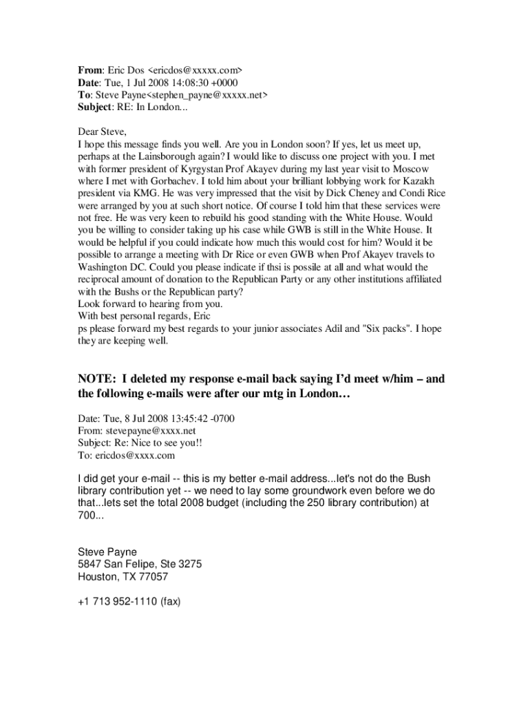 From: Eric Dos ericdos@xxxxx.com Date: Tue, 1 Jul 2008 14:08:30 +0000 To: Steve Paynestephen_payne@xxxxx.net Subject: RE: In London... Dear Steve, I hope this message finds you well. Are you in London